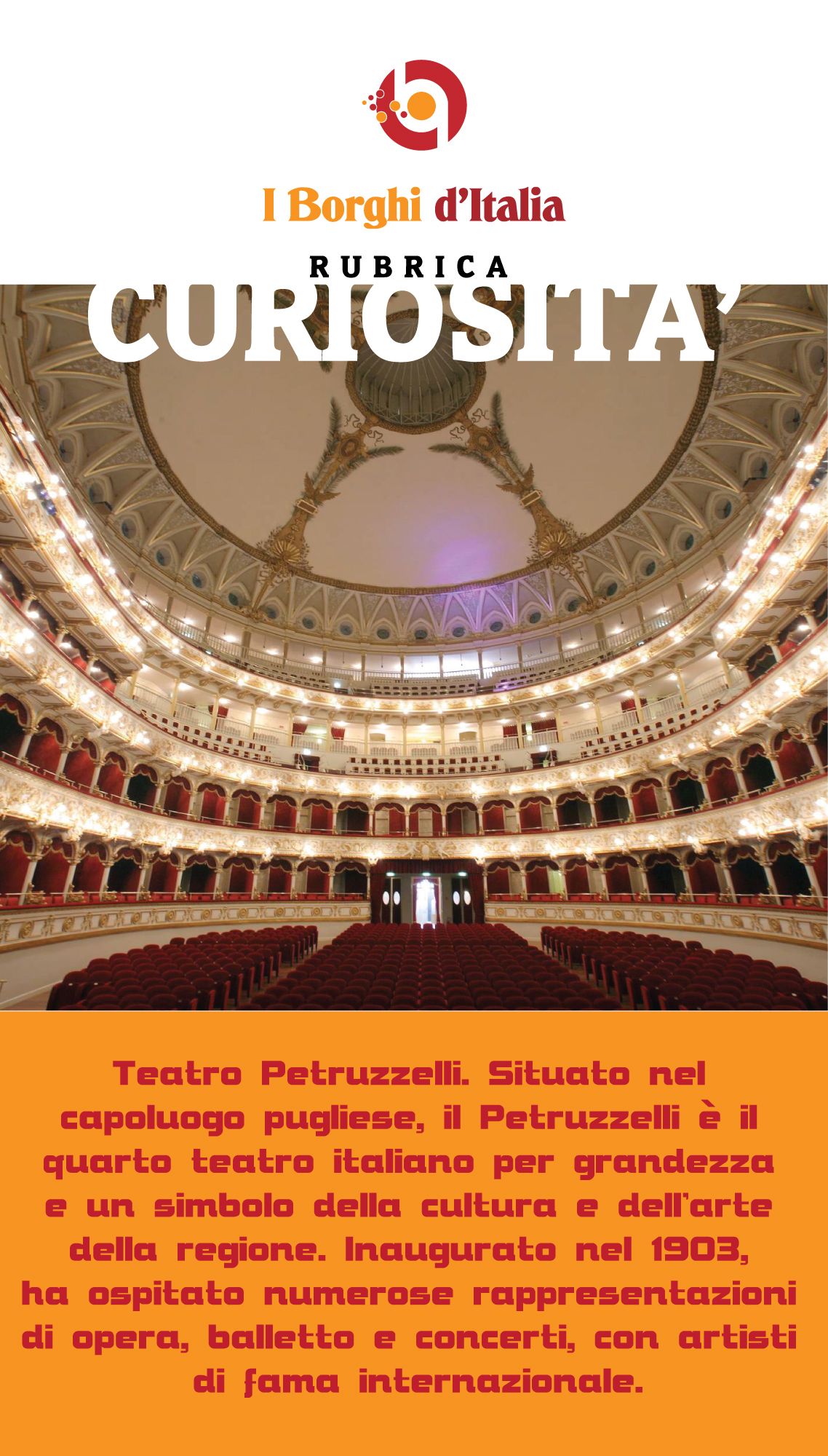 Curiosità: La provincia di Bari ospita uno dei teatri più importanti e prestigiosi d’Italia, il Teatro Petruzzelli. Situato nel capoluogo pugliese, il Petruzzelli è il quarto teatro italiano per grandezza e un simbolo della cultura e dell’arte della regione. Inaugurato nel 1903, ha ospitato numerose rappresentazioni di opera, balletto e concerti, con artisti di fama internazionale. Dopo un devastante incendio nel 1991, il teatro è stato completamente restaurato e riaperto nel 2009, tornando a essere un centro vitale per la scena culturale italiana e internazionale.