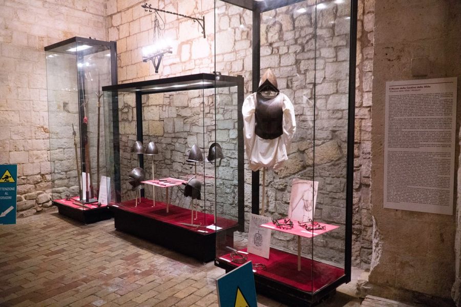 Beni d’inestimabile valore sono oggi custoditi tra le mura di questo luogo sacro, nella cappella sovrastante il nartece si trovano manoscritti che raccontano il lascito d’immobili, case e latifondi, ma anche oggetti preziosi e gioielli, spesso originari della Terra Santa e realizzati da artigiani francesi. Tra questi suppellettili, due sono molto importanti e particolari: il primo è una colomba eucaristica in rame, datata 1184 e realizzata con l’antica tecnica del champlevè. Il secondo è una stauroteca a forma di croce che come da tradizione conteneva i resti della croce di Cristo ed è stata portata nella città pugliese dal patriarca di Gerusalemme nel 1291.