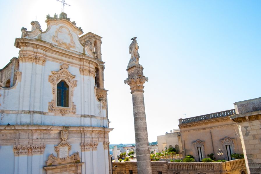 Sant’Andrea apostolo, patrono di Presicce, osserva i suoi fedeli dall’alto della sua colonna. A lui è dedicata la chiesa madre del paese, con una facciata in stile Barocco che allo stesso tempo non rinuncia ad essere sobria ed elegante, grazie anche al color perla delle mura.