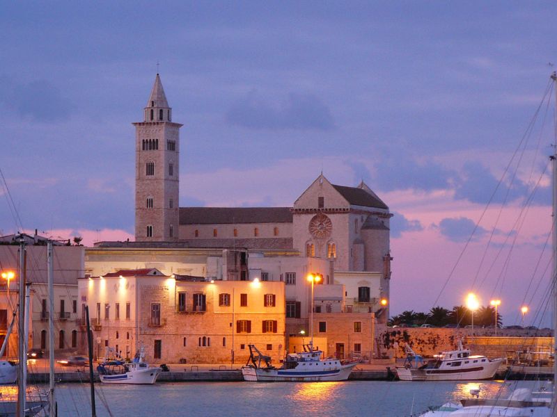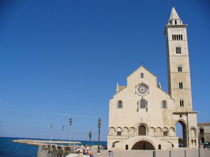 Non una cattedrale qualsiasi, ma La Cattedrale. È d’obbligo la lettera maiuscola quando si parla della più bella cattedrale di Puglia, esempio più alto ed eccelso dello stile romanico pugliese. Isolata dal resto della città, magnificente nel suo protendersi verso l’alto, con un candore dato dall’uso della pietra calcarea locale, la pietra di Trani. Il mare arriva a lambire le sue coste, come un continuo promemoria che le ricorda che parte della sua bellezza e della sua grandezza è dovuto proprio a quella distesa d’acqua. Dal mare arrivò Nicola, pellegrino greco che girava le coste del Mediterraneo per portare la parola di Cristo, ma una volta sbarcato il ragazzo morì, probabilmente per la fame patita. Venne canonizzato e San Nicola il Pellegrino è diventato da allora la vera fortuna di questo borgo, in un tempo in cui le reliquie erano merce preziosa, in grado di determinare l’importanza e l’onore di una città.