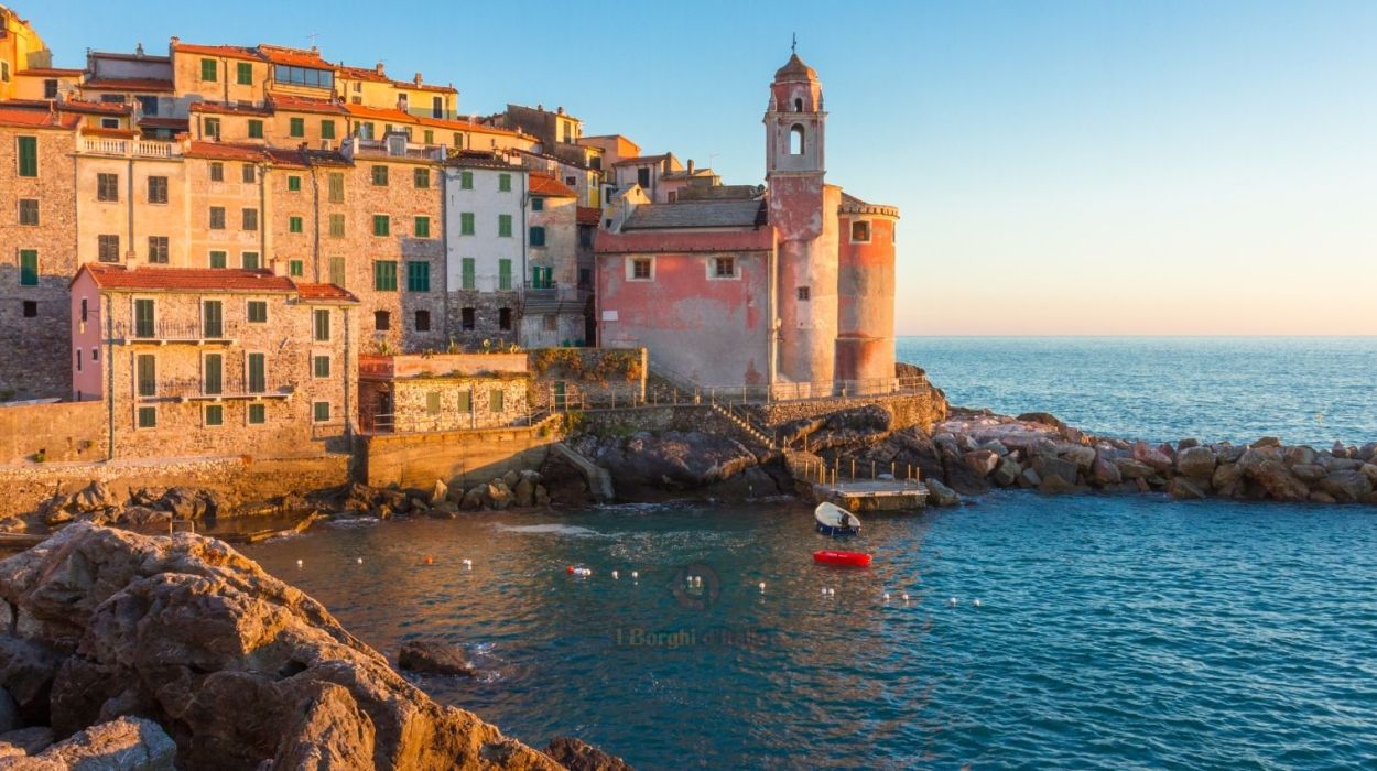 Le case, dai tipici colori pastello – rosa, giallo, arancio – sono aggrappate le une alle altre, quasi a difendersi, creando un labirinto di caruggi stretti e silenziosi che degradano verso il mare. Al centro di questa scenografia mozzafiato, proprio a picco sulla scogliera, si erge la Chiesa di San Giorgio, il cui campanile è un’antica torre d’avvistamento.