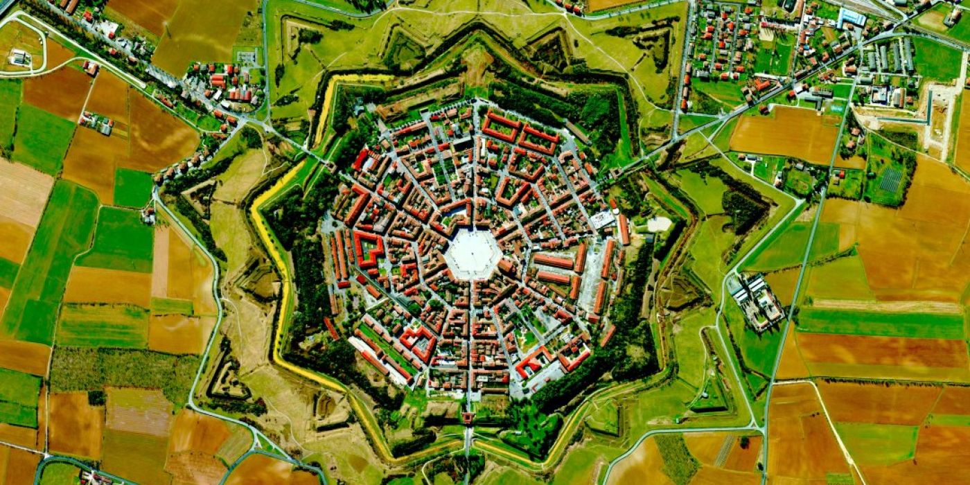 Situata in Friuli Venezia Giulia, questa cittadina non è un semplice borgo, ma un monumento nazionale e patrimonio dell’umanità UNESCO. Chiunque osservi una sua mappa dall’alto non può che restare sbalordito dalla sua perfezione: una stella a nove punte assolutamente simmetrica, concepita dalla Repubblica di Venezia nel 1593 come la fortezza inespugnabile per eccellenza.