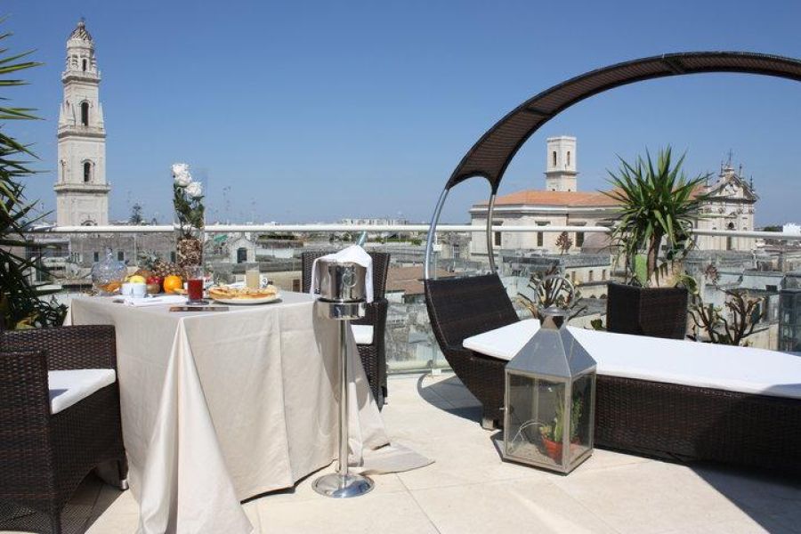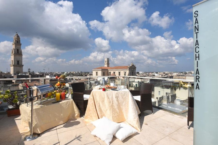 The hotel also offers room service, and the staff is at your complete disposal to make your stay unforgettable. Located next to the extraordinary Church of Santa Chiara, the hotel is within walking distance of Lecce's most picturesque sites: 50 meters from Piazza Sant'Oronzo and the ancient Roman amphitheater, 100 meters from the Basilica of Santa Croce, with its famous rose window, the most important example of Lecce's Baroque art, and finally 130 meters from the spectacular Piazza del Vescovado with the world-famous Duomo.