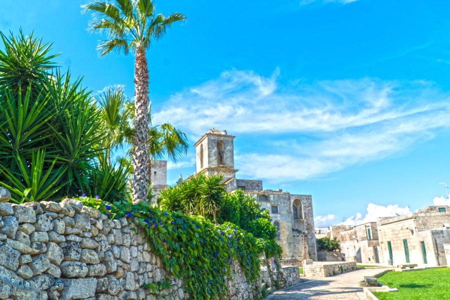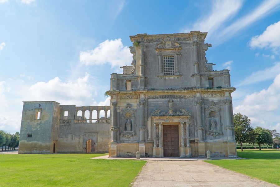 Poco lontano dal centro abitato, circondato da un prato che contribuisce a suscitare un senso di profonda beatitudine: in questo contesto si stagliano l’Ex Convento degli Agostiniani e la Chiesa del Carmine. Il 1573 è la data che segna l’inizio dei lavori per la costruzione del Convento, quando la chiesa del Carmine è stata affidata all’ordine degli agostiniani. L’intero complesso è stato restaurato nella prima metà del ‘Seicento, con un progetto dell’architetto Giuseppe Zimbalo, che riuscì a far arrivare in questo piccolo borgo lo strascico del Barocco leccese, chiaramente visibile soprattutto nei fregi del portale. Le colonne, accostate sempre al portale, sorreggono la trabeazione con la statua della Madonna del Carmelo ed insieme alle altre presenti sulla facciata danno il senso del ritmo all’intero prospetto.