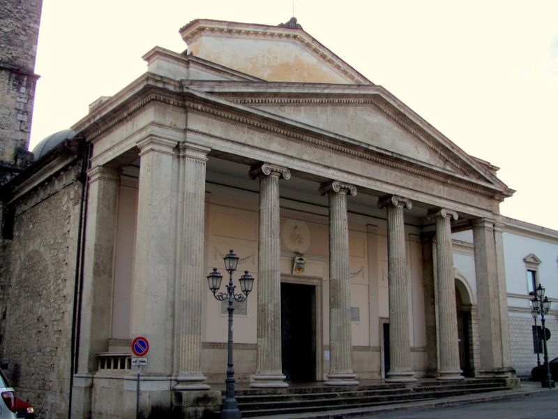 Nel corso dei secoli calamità naturali ed incuria umana hanno portato quest’edificio sacro a dover subire numerosi rifacimenti che ne hanno alterato le fattezze originarie. L’aspetto che oggi vediamo si deve in gran parte alle modifiche apportate nel XIX secolo per volontà del vescovo Paladino che ha voluto dare alla chiesa un’impronta neoclassica, come si può vedere fin dalla sua facciata. Il prospetto è caratterizzato da un timpano in travertino, sorretto da pilastri laterali e quattro colonne centrali.