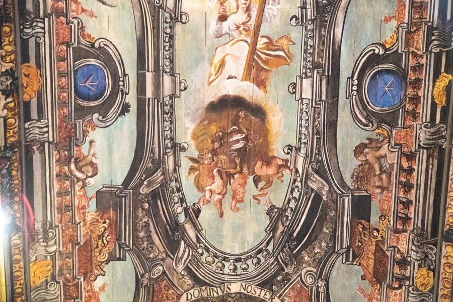 Il soffitto è raro nella provincia di Lecce, in stile moresco, con cassettoni in legno dorati su sfondo bianco e nero.